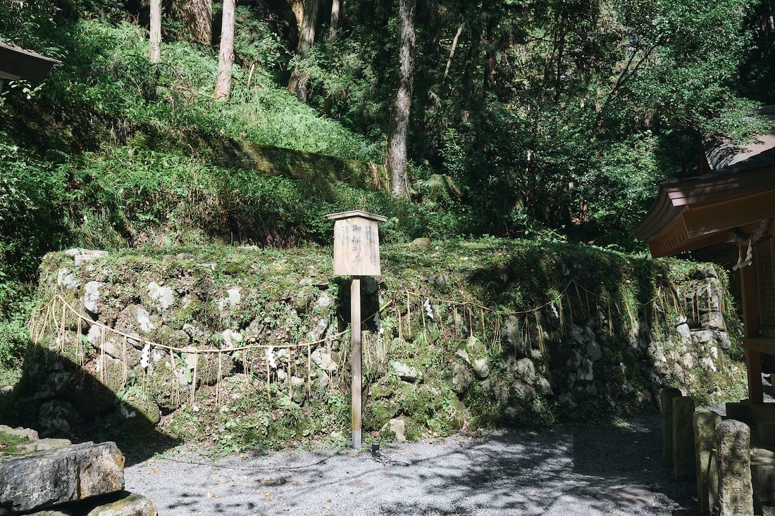 奥宮本殿の左にある「船形石」。玉依姫命が川をのぼってきた“黄色い船”を隠すように、石が積み上げられている(写真:右)