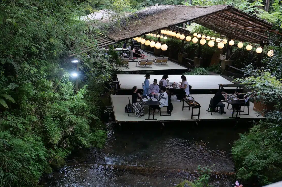貴船の川床は、大正時代に始まった。夏場は京都中心地からでも10度ほど気温差があると言われ、涼を求める人の姿で賑わう