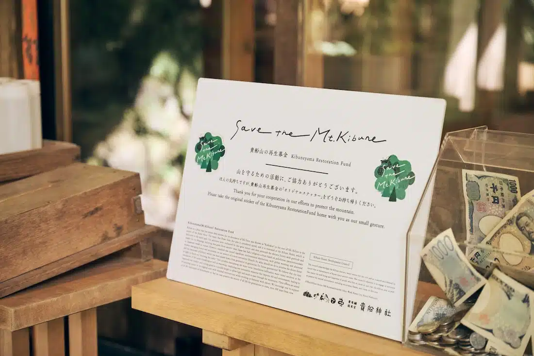 今回、MIZUBAの取材では、「水と人との関わり」を伺いたいと思い、貴船神社にお願いしてまずは下見に伺った。本殿のすぐ横に「山を守るための活動に、ご協力をお願いいたします」と書かれた募金箱に目が止まった。
