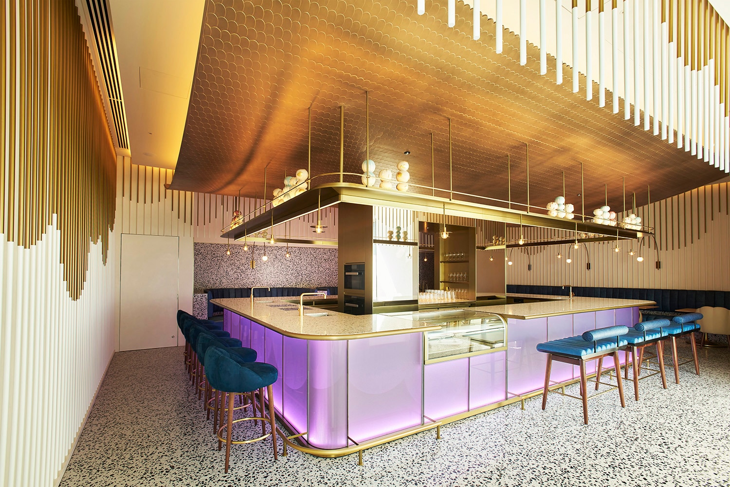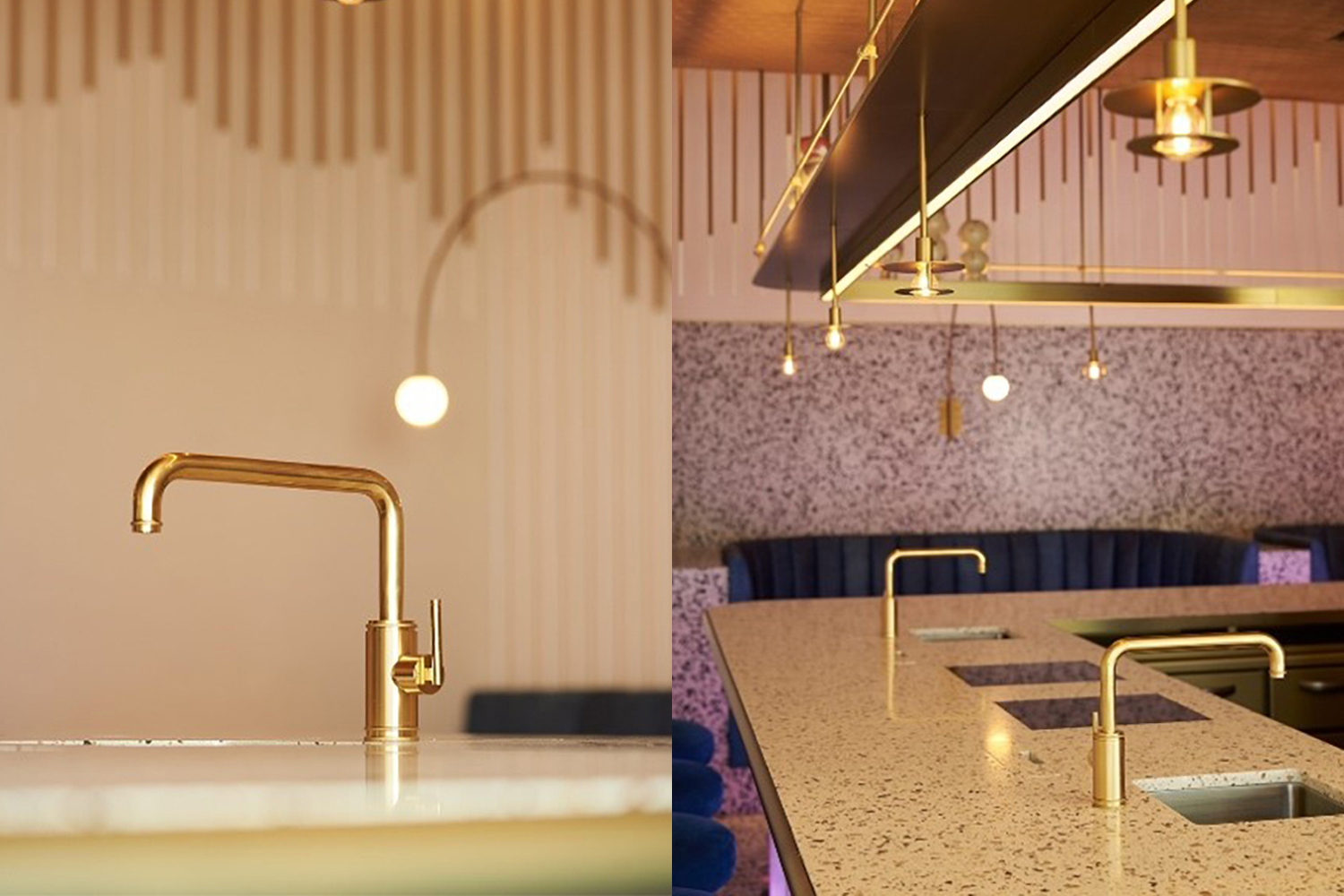 内装はゴールド色とネオンカラー、テラゾーのカウンターが調和し、細部までこだわった装飾と合わさって印象的な空間になっています。こちらの店内では、SANEIのcyeシリーズよりブラス色の水栓が採用されました。