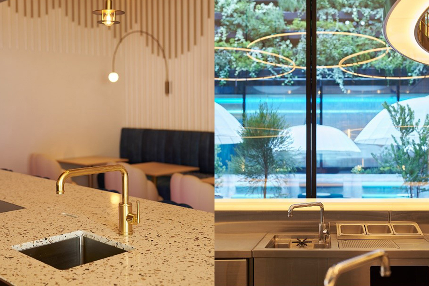 水栓もインテリアとして捉え、1Fのパティスリーではメインカラーとなるゴールドや、壁面に施された円筒形の装飾に合う形状と色の水栓が、4Fのバーでは内装に使用されているブルーの壁面タイル、プールや空の色、デッキから見える自然を引き立てるシルバー色の水栓が選ばれています。