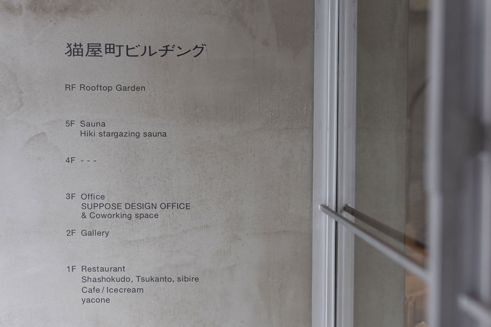 ビルには1階から5階までの5フロアに加え、屋上テラスを備えています。1階は4つの飲食店が集結する “食”の場。2階はギャラリー兼イベントスペース。3階は建築設計事務所サポーズデザインオフィスの本社とコワーキングスペースからなる“働”の場。4階は現在活用に向けて構想中の空間で、5階には、自然光が入る坪庭を眺めながらサウナに入り、空を見ながら“ととのう”ことができる半屋外サウナ「Hiki stargazing sauna」です。屋上には、サウナ後に休憩したり、青空ワークエリアとしても使用可能な開放感あふれる空間『Rooftop Garden』が広がります。(屋上は現在準備中。解放日未定)