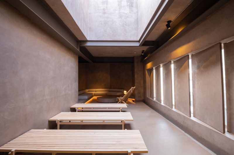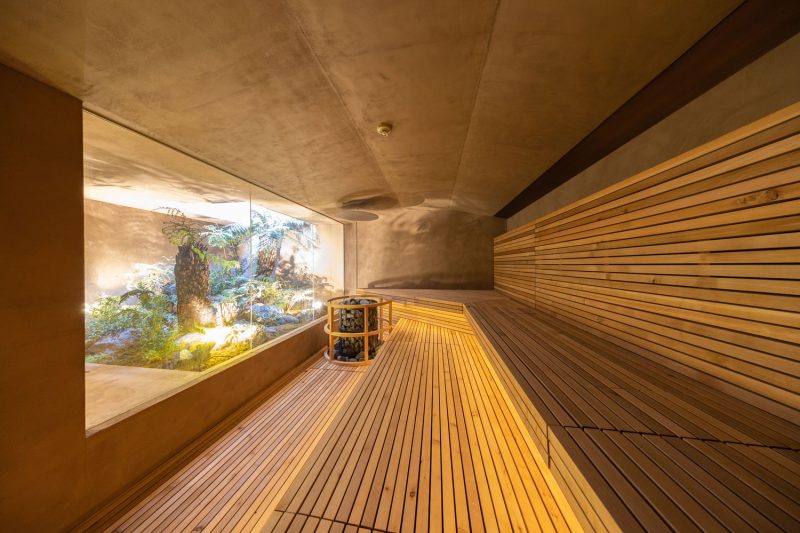 5階に設けられている、坪庭を眺めながら楽しめるサウナは、空に吹き抜けた天井から太陽が降り注いだり、時には雨が降ったり、夜には星を見ながら…と、自然を肌で感じることができる特別な空間。そこに当社「cye」シリーズの水栓・カラーNCUが採用され、風景に溶け込むように存在しています。谷尻さんデザインのこのシリーズは、ご本人もとても気に入っているとのことで、ご自宅や別荘でもこの水栓を使っているそうです。