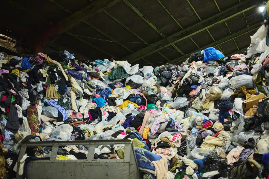 サンウエスパで回収された古着。国内で役目を終えた衣類は、東南アジアから買い付けにくる業者によって分別され、“次に必要とする人”のもとへと届けられる
