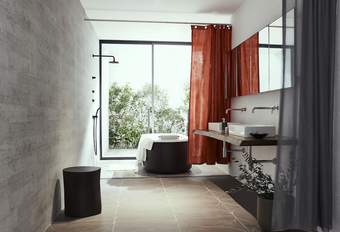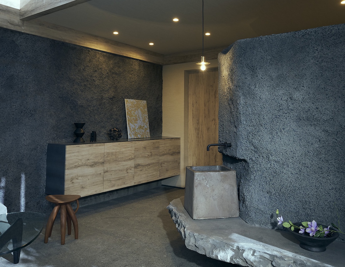 自然素材に囲まれた土間空間に設けられた洗面。コロナ禍を経て、帰宅後すぐに手を洗う習慣を支える新しい暮らし方の提案として、SANEIが発信したアイデア